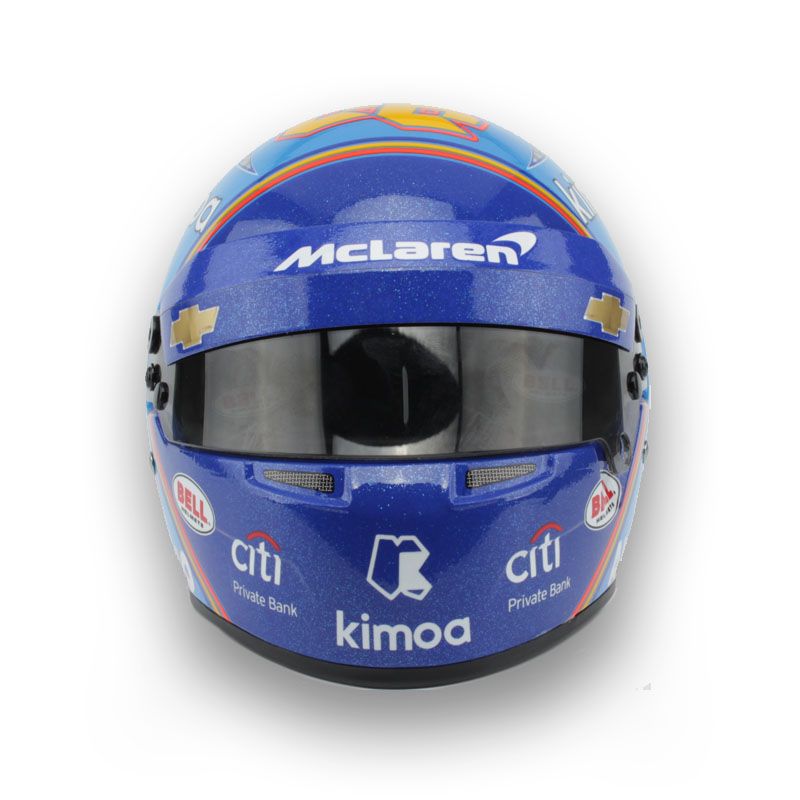 Mini casco coleccionable Bell, replica del casco que uso Fernando Alonso en las 500 Millas de Indianápolis en 2019.