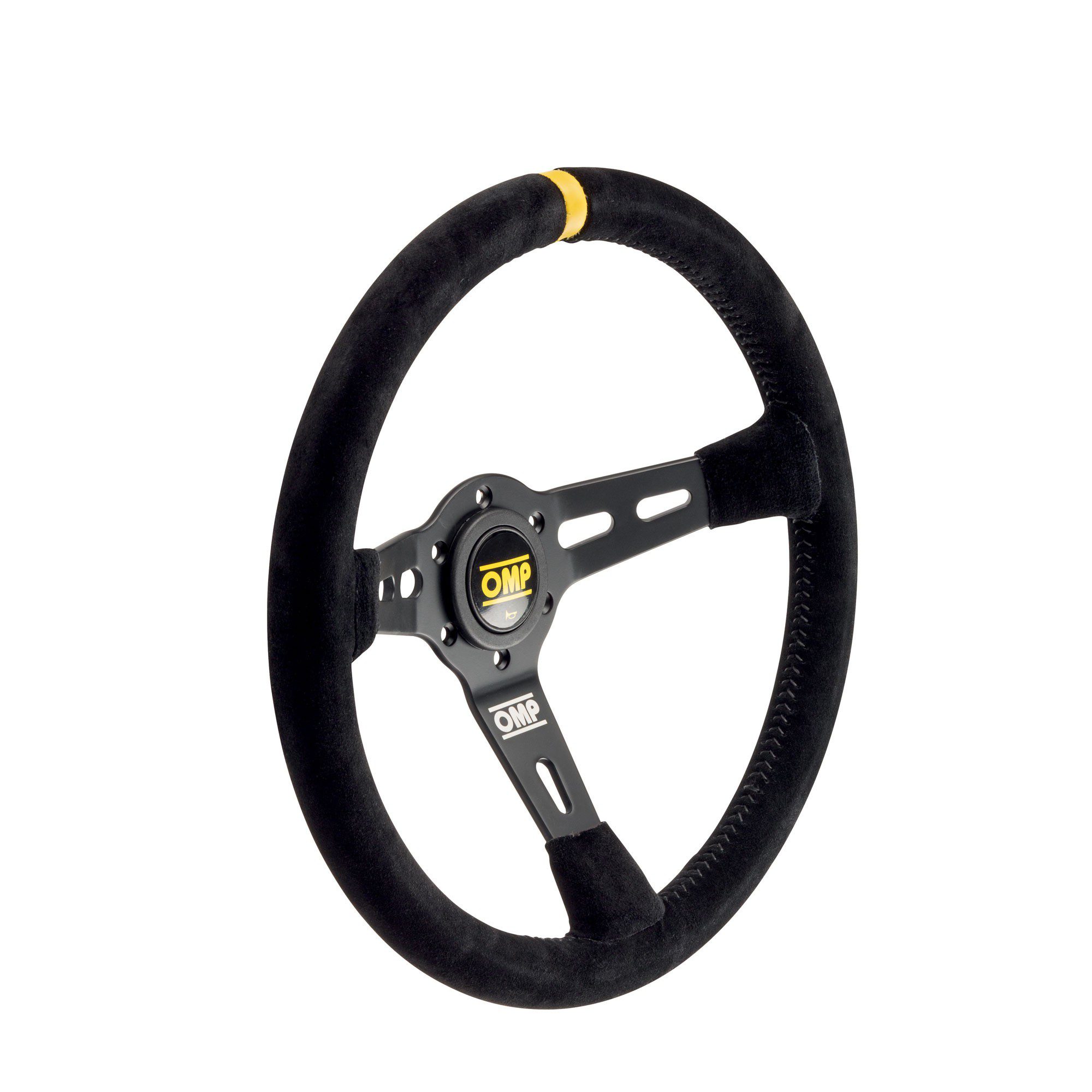 Volante de nivel de entrada de profundidad media con tres radios de aluminio. Empuñadura redonda en piel de gamuza negra, visor amarillo. Botón de bocina incluido.