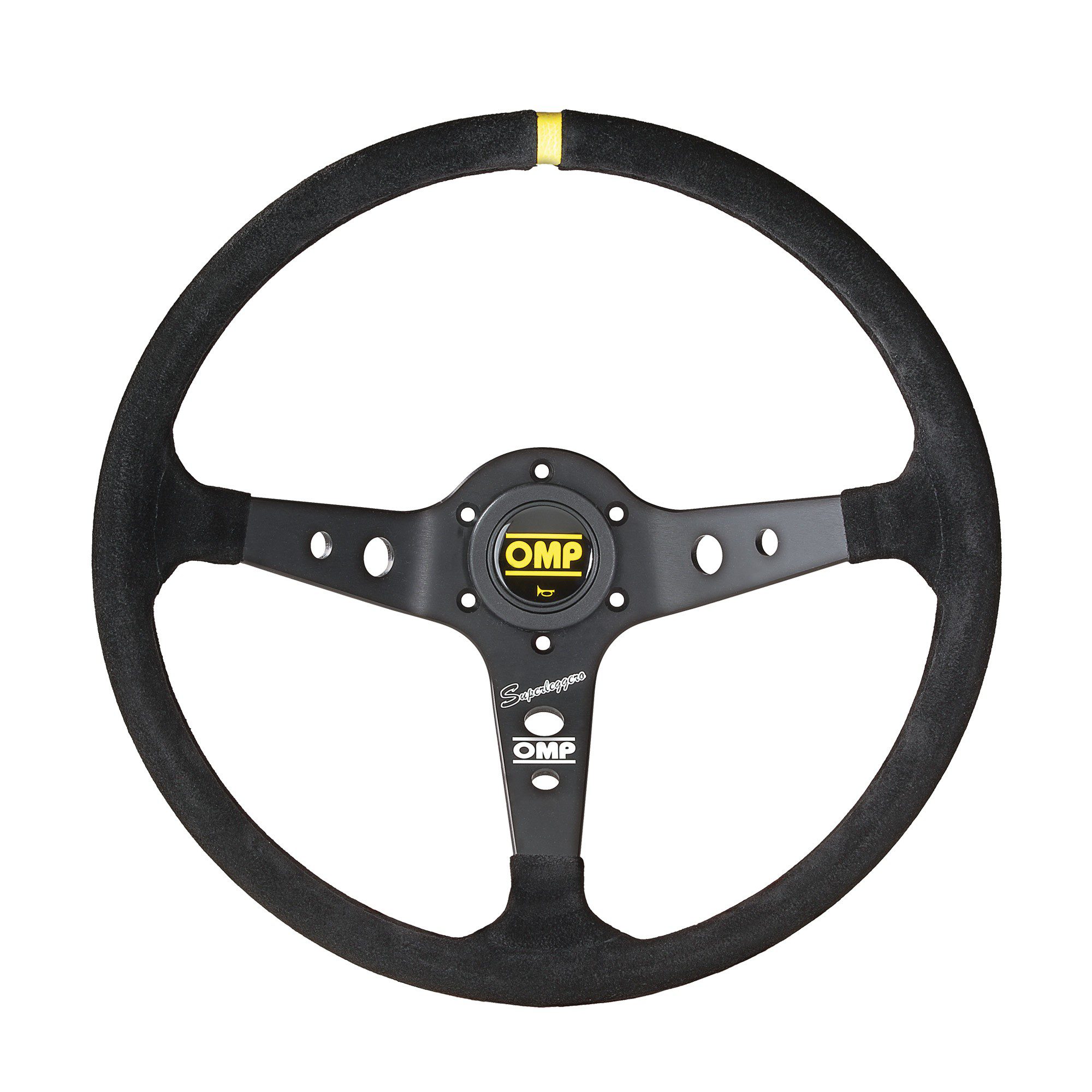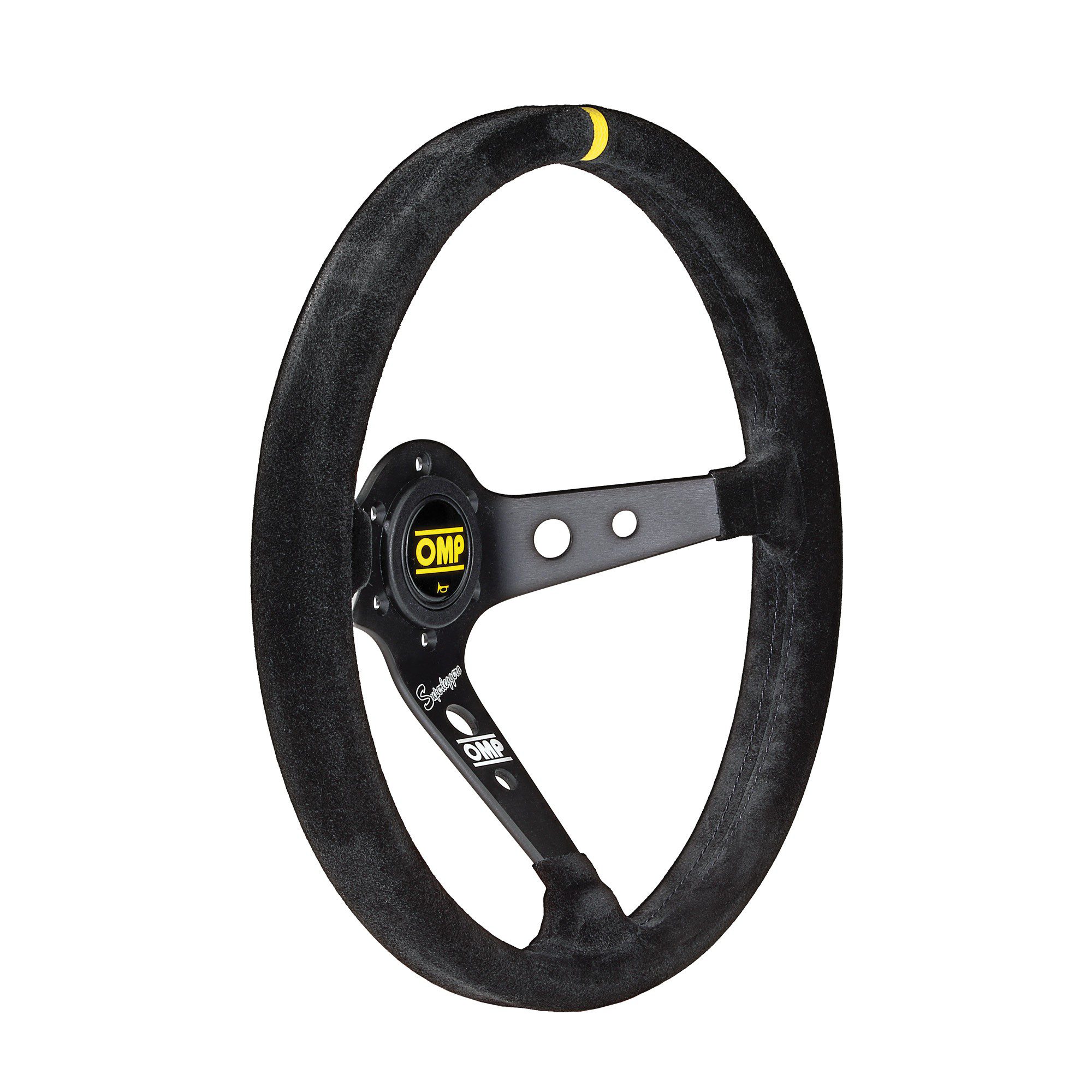 Volante con 3 radios de aluminio anodizado negro, en piel de gamuza, costuras negras. Se suministra con botón de bocina. Profundidad 95 mm.